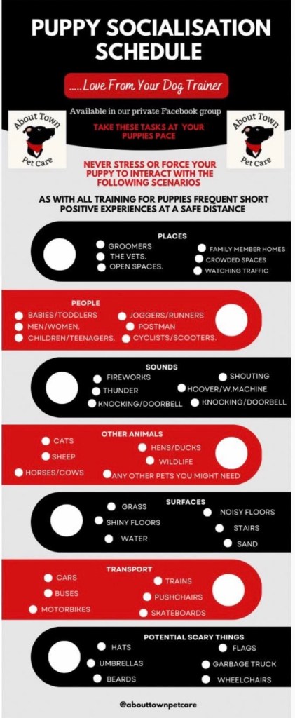 Find my socialisation check list below (remember to take it slow) and more importantly have fun with your new pup.
