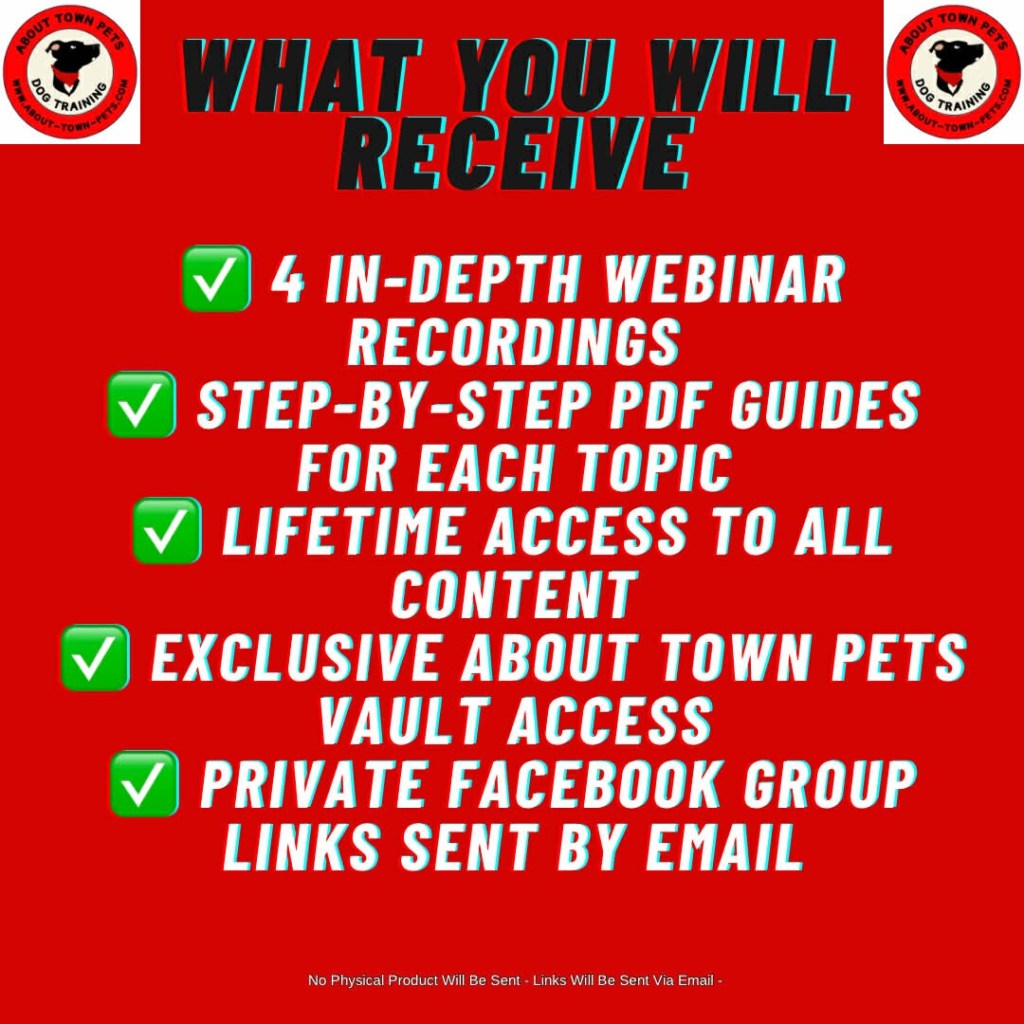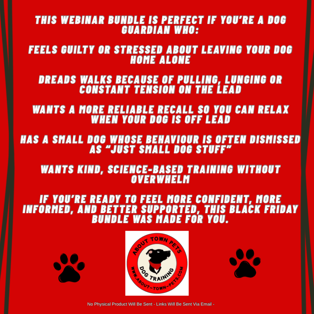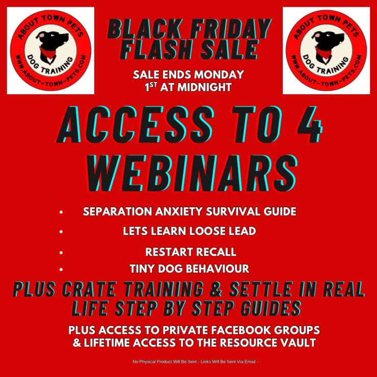 Get Lifetime Access to 4 x behaviourist led recordings of my most popular dog training and behaviour webinar topics, PDFs guides and resources via the About Town Pets Vault, normally only accessible to weekly webinar and 1-2-1 training clients.
