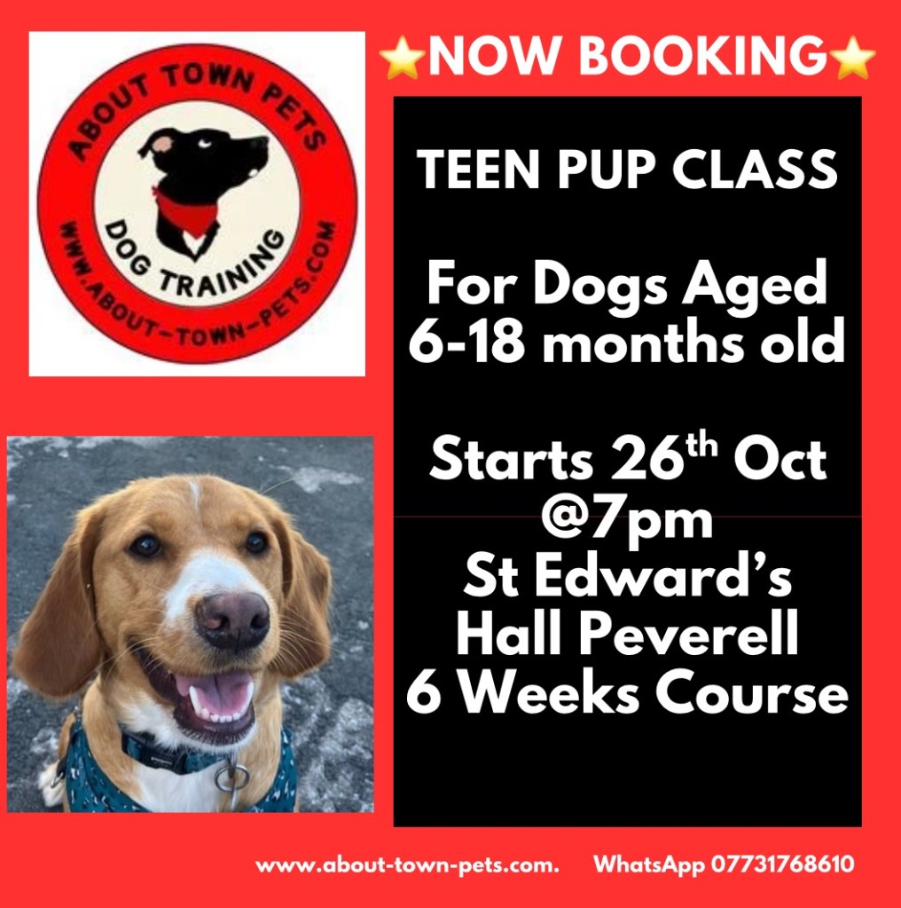 Teen Pup Classes (Adolescent Dogs) are returning on Sunday 26th October and run for 6 weeks for dogs aged 6-18 months old – Class is held at 7pm in St Edward’s Hall in Peverell Plymouth PL3 4PG